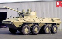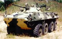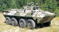Бронетранспортер БТР-90 создан в 1994 году. Закрытый сварной корпус из катанных броневых листов обеспечивает защиту от крупнокалиберных пуль и осколков артиллерийских снарядов. Силовая установка состоит из многотопливного дизельного двигателя мощностью 510 л.с. Колесная формула -8x8, бескамерные широкопрофильные пулестойкие шины имеют центральную систему регулирования давления воздуха. Подвеска колес независимая торсионная, с телескопическими гидроамортизаторами. Для движения на воде используется водометный движитель.
